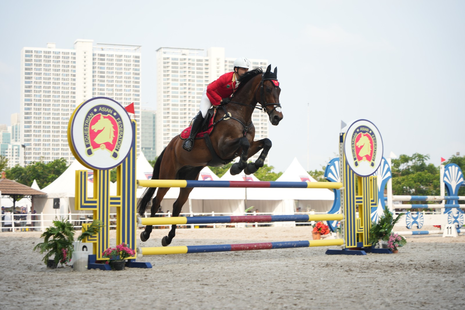 Pada pertandingan hari pertama kejuaraan berkuda yang hanya menggelar pertandingan Show Jumping tersebut, Super Dinov berhasil meraih medali emas dari kelas ESC Cat. A 95-105 Cm bersama kuda Maura dan medali perak di kelas Jakarta Hunter Derby Team dengan kuda Blue Diamond B. Satu tambahan gelar peringkat kelima juga diraih Super Dinov dari kelas Indonesian Rising Star Championship 115-120 Cm bersama kuda Lenneke.